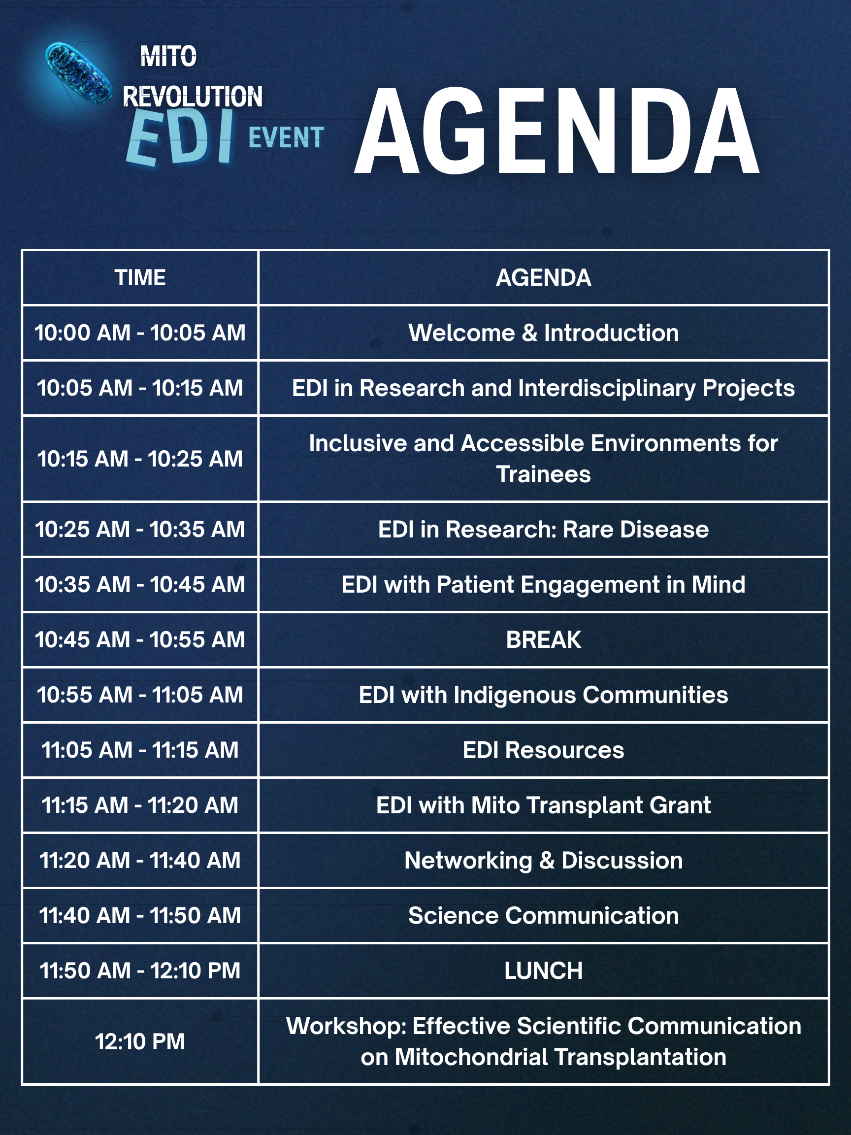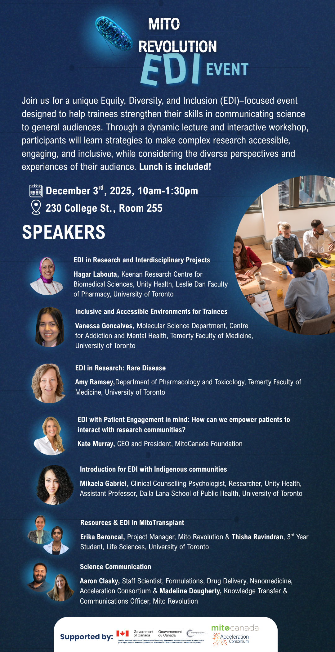 Join us on Wednesday, December 3rd 2025 for a unique Equity, Diversity, and Inclusion (EDI)–focused event designed to help trainees strengthen their skills in communicating science to general audiences. Through a dynamic lecture and interactive workshop, participants will learn strategies to make complex research accessible, engaging, and inclusive, while considering the diverse perspectives and experiences of their audience.